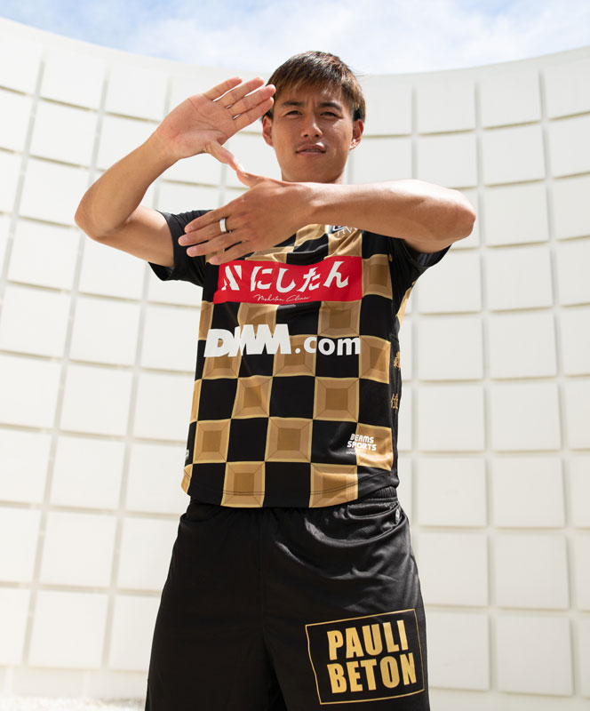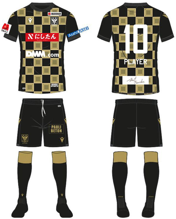 新アウェイユニフォームは、ブラックを基調にゴールドというカラーコンビネーション。基本的なデザインは各キット共通で『市松模様』を使用する。