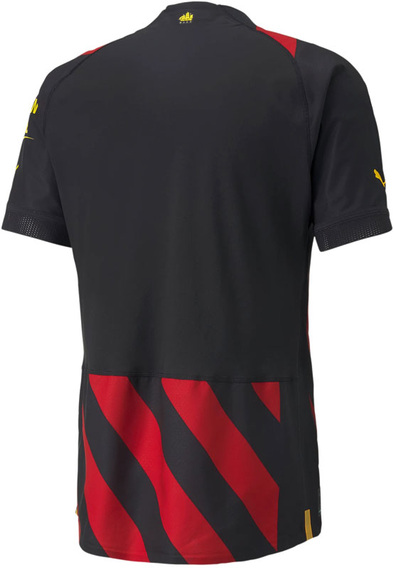 これまでレッド&ブラックの斜めストライプを「たすき掛け」にしたことはあっても、シャツ全体に配したスタイルは過去に例がない。斜めストライプはエンブレムにデザインされているもので、これはマンチェスター市を流れる3つの川(アーウェル川、メドロック川、アーク川)を表している。
