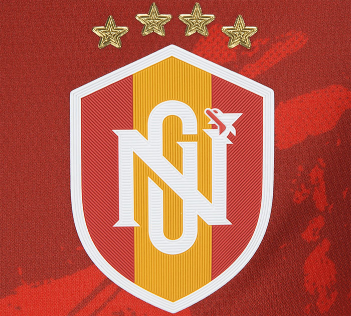 今回のユニフォームには30周年記念の特別エンブレムを採用している。グランパスの「ファミリーの象徴シャチ」と「Never Give Upマインド」のふたつを、伝統のカラーリングを継承した盾型のシルエットで表現。