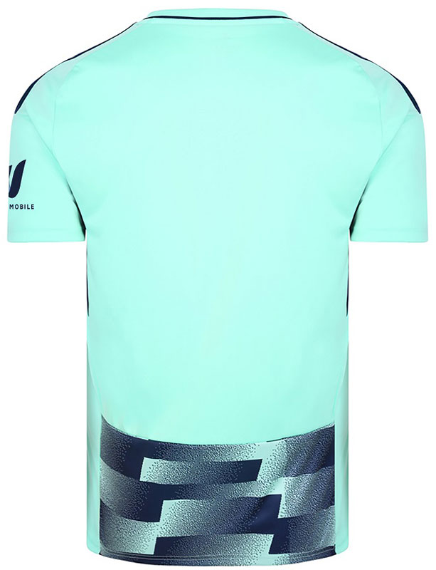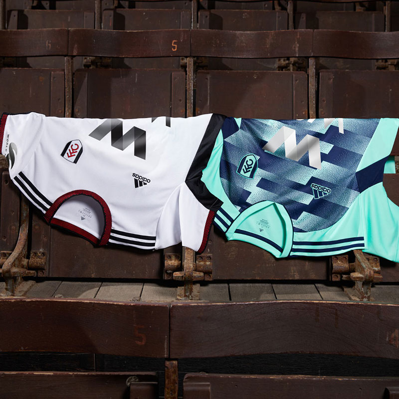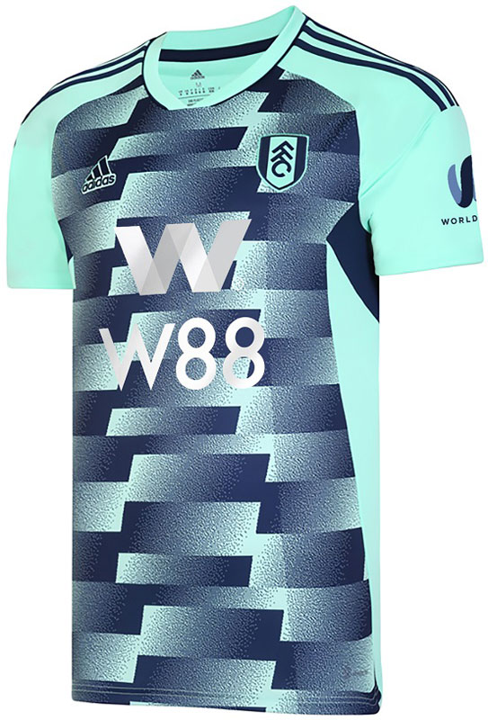 22-23新アウェイユニフォームのベースカラーにはパルスミントを採用。前面のグラフィックは、ホームスタジアム「クレイヴン・コテージ」のレンガ造りをモダンに解釈したデザインだという。