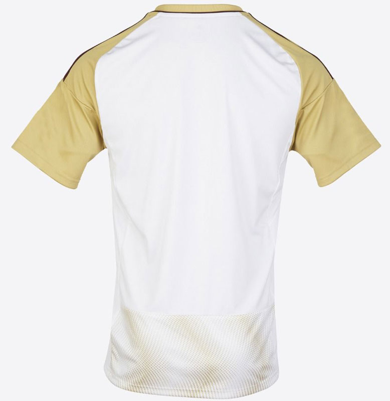 22-23新サードユニフォームはホワイトを基調に、肩・袖部分とウェーブ状のグラフィックにゴールド(クラブ側の説明ではベージュ)を採用。そしてスポンサーロゴ、袖のスリーストライプス、エンブレムなどはマルーンで彩る。