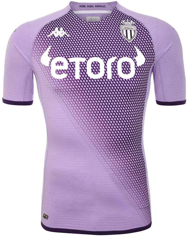 22-23新サードユニフォームはライトパープルを基調に、前面のグラフィック部分にダークパープルを組み合せた“濃淡紫色”が織り成すデザイン。濃い部分に散りばめている細かな模様は、モナコ公国の国章に描かれているダイヤモンドパターン。