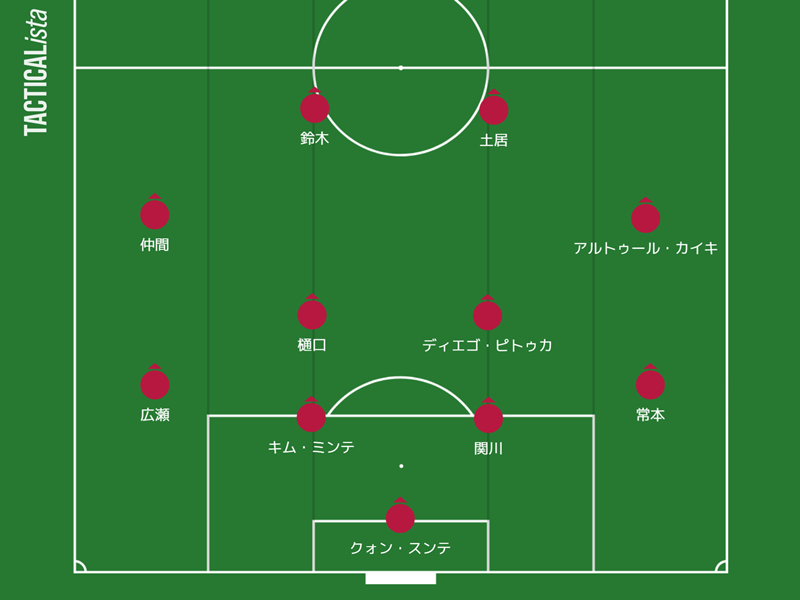 結論としては、スタメンに大幅な変更はなく、出場停止の三竿健斗に代わって関川郁万がセンターバックに入り、前線に仲間隼斗と土居聖真が起用された。今季ここまでリーグ戦で出場機会がなかった林尚輝と小川優介がベンチ入りしたことの方が、サプライズだったかもしれない。(林は81分に広瀬陸斗と交代で投入され、今季初出場を果たした)