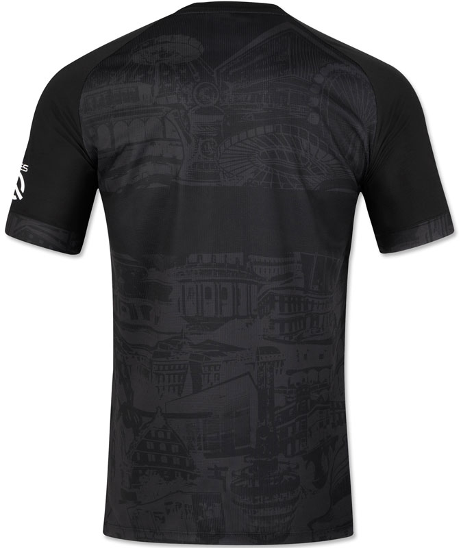 22-23新サードユニフォームはブラックを基調とした中に、ホームと同じく動物園や宮殿、教会など街を構成する24のランドマークを透かしでプリント。キットカラーに合わせてエンブレムはモノクロームに変更し、スタイリッシュなデザインに仕上げている。