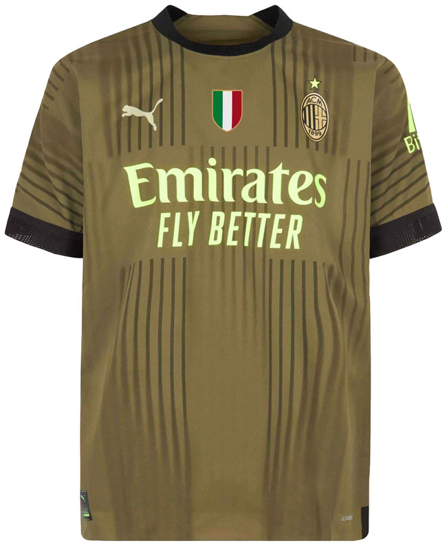 22-23新サードユニフォームは、グリーン(オリーブ)を基調にグラデーションをかけたストライプが印象的なデザイン。エンブレムはキットカラーに合わせて、イエローのモノクローム仕様となっている。