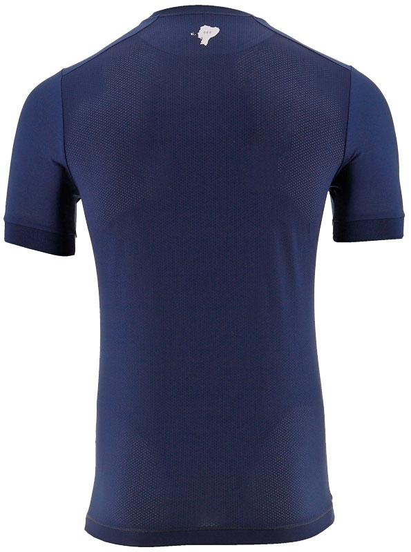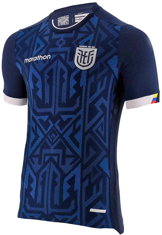 2022新アウェイはネイビーを基調とし、ライトブルーで幾何学模様の個性的なグラフィックを描くデザイン。袖にはエクアドル国旗カラーを配し、代表チームとしての誇りを刻む。