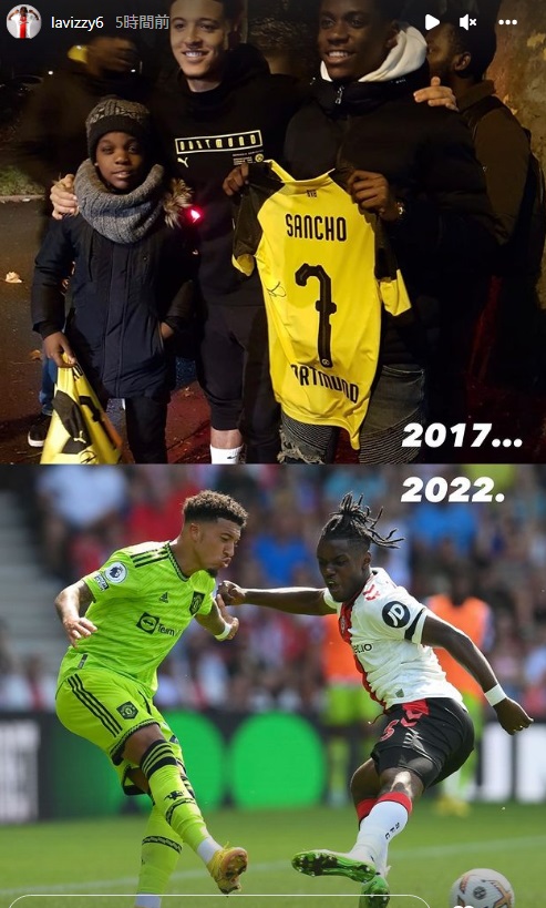 現在18歳のラヴィアはこの夏にマンチェスター・シティからセインツに移籍したベルギー人選手。アンデルレヒトのユースチームに所属していた2017年当時にファンとしてサンチョに会った彼は5年後に対戦相手として再会を果たしたようだ。