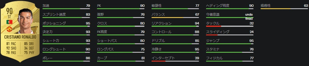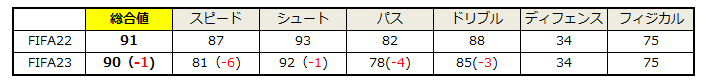 ロナウドはスピードがかなりダウンしており、加速は85→79、ダッシュ(スプリント)速度も88→83に下がっている。