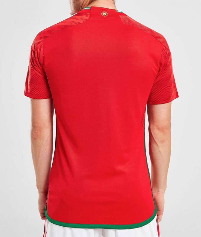 2022新ホームユニフォームは伝統のレッドを基調とし、斜めに落とし込むグラフィックが力強さを感じさせるデザイン。エンブレムと首周りはグリーン、スリーストライプスはホワイトで彩り、国旗色の3色を使ったカラーコンビネーションとなっている。