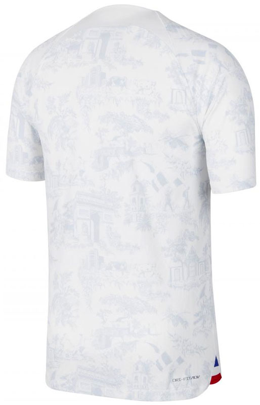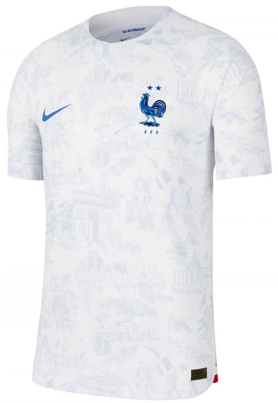 2022新アウェイユニフォームはホワイトを基調とし、シャツ全体がグラフィカルなデザイン。これはフランスのトワル・ド・ジュイと呼ばれる伝統的な布(生地)にインスパイアされたものだという。裾の脇には国旗色のトリコロールを配する。