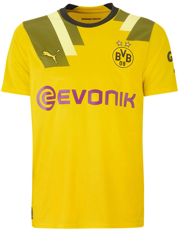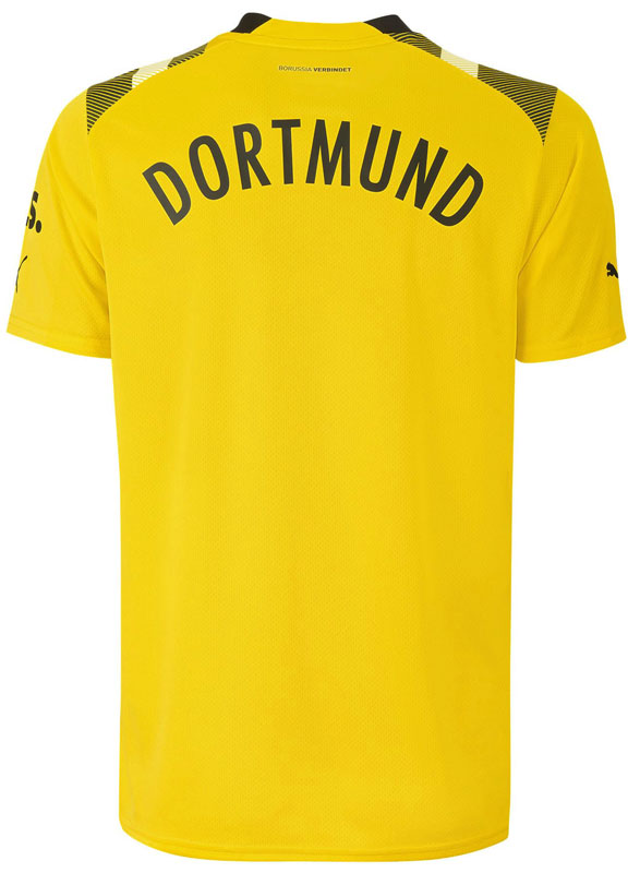 22-23カップ戦用ユニフォームはお馴染みのイエローを基調に、両肩部分にアイコニックなストライプを描く。背中上部にチーム名“DORTMUND”をレタリングするが、これはDFBポカール仕様。CLでは背番号下の腰部分に位置を変える。