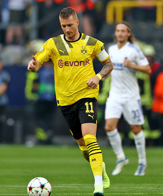 パンツはブラックで、ソックスはイエローを基調にブラックのボーダー柄。今季のブンデスリーガ用ホームキットを兼用で使う。