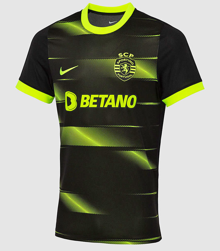 22-23新アウェイユニフォームは、ブラックを基調に蛍光色のヴォルトグリーンを組み合せたデザイン。エンブレム、スポンサーロゴ、段違い的に配した斜めグラフィックなどは全てヴォルトグリーンで彩り、かなり鮮烈な印象を与える。