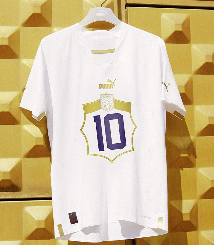 2022新アウェイユニフォームは、定番のホワイトを基調にゴールドの差し色という組み合せ。胸には各国のPuma2022アウェイユニフォームと同様に独特なグラフィックをあしらう。