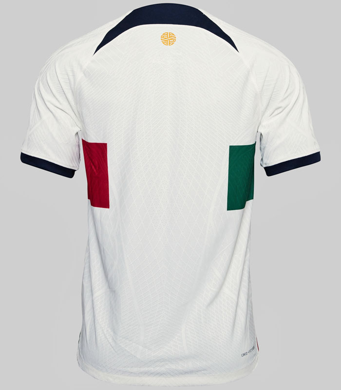2022新アウェイユニフォームは。ポルトガルの定番カラーであるホワイトを採用。真っ白いうよりは、少し暗めでアイボリーに近い色合いとなっている。胸にはポルトガル国旗を模した形でボーダー柄で、新ユニフォームはホーム・アウェイどちらも国旗を強調したデザインとなった。