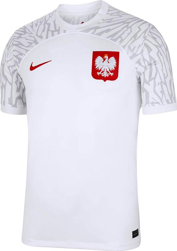 2022新ホームユニフォームは、ホワイトを基調にエンブレムやスウッシュ(Nikeロゴ)にレッドを配する伝統の国旗カラー。肩から袖にかけての模様は、エンブレムにも描かれているポーランド国章の“白い鷲”の羽と巣をモチーフとしている。