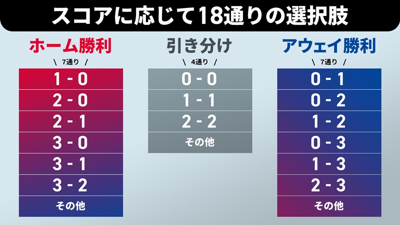 こちらが18の選択肢。それぞれのチームの勝利が各7通り、引き分けが4通りで、合計18通りの中から選ぶ形だ。