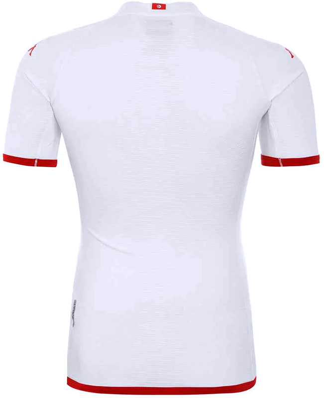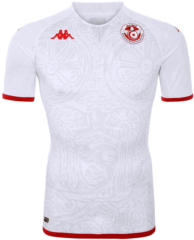 2022新アウェイユニフォームはホワイトを基調とし、ホームと同じくハンニバル・バルカが身に付けていた“銅鎧”を描いたデザイン。ホーム、アウェイともに背面首元にはチュニジア国旗を付ける。
