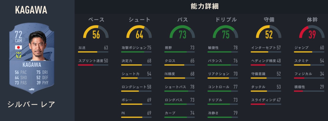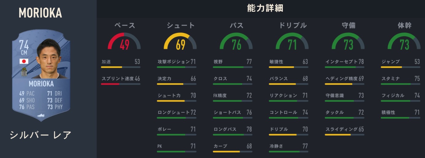 能力値:74、特性:ロングシューター(AI)、プレイメーカー(AI)、アウトカーブ、チームプレイヤー