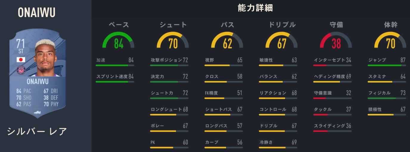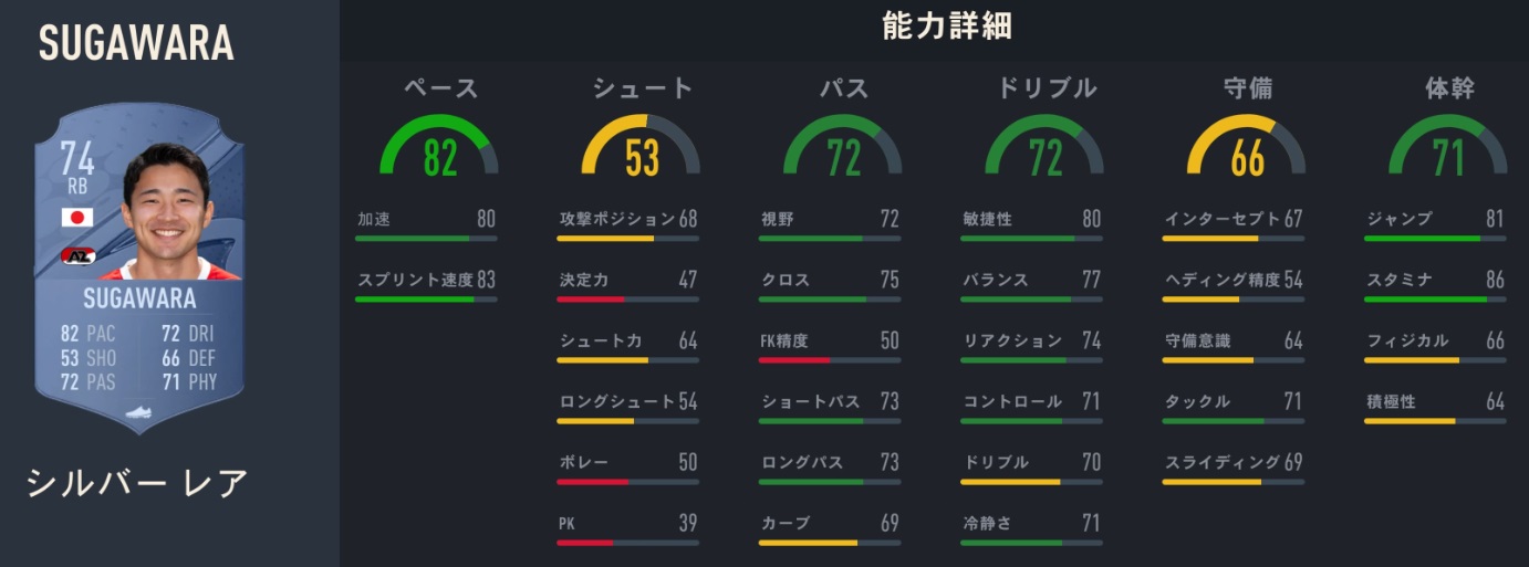 能力値:74、特性:ロングスロー、アーリークロス