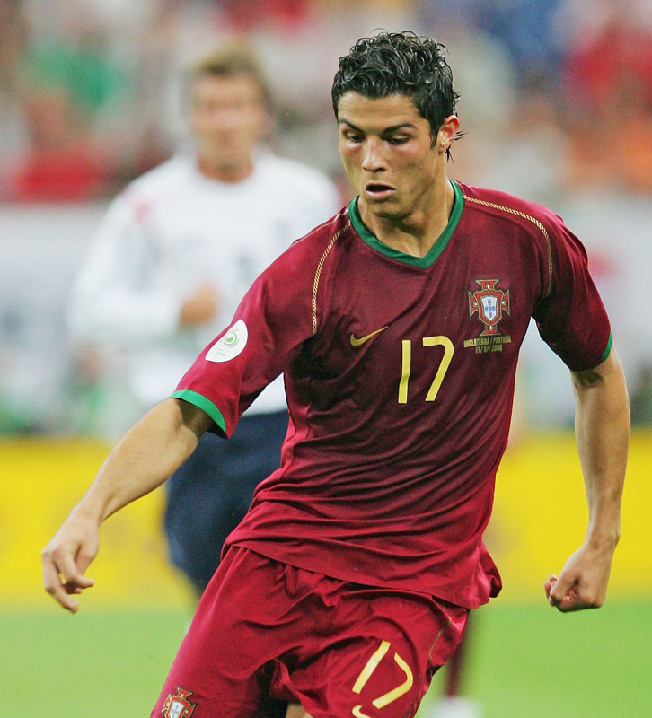 2002年日韓大会のユニフォームと比べると、より赤(臙脂)が濃くなった06W杯モデル。襟から脇にかけて延びるパイピングのようなチェーン状の装飾が目を引く。Vネックと袖口にのみ緑を配したシンプルでクラシックな色使いがポルトガルらしいデザイン。