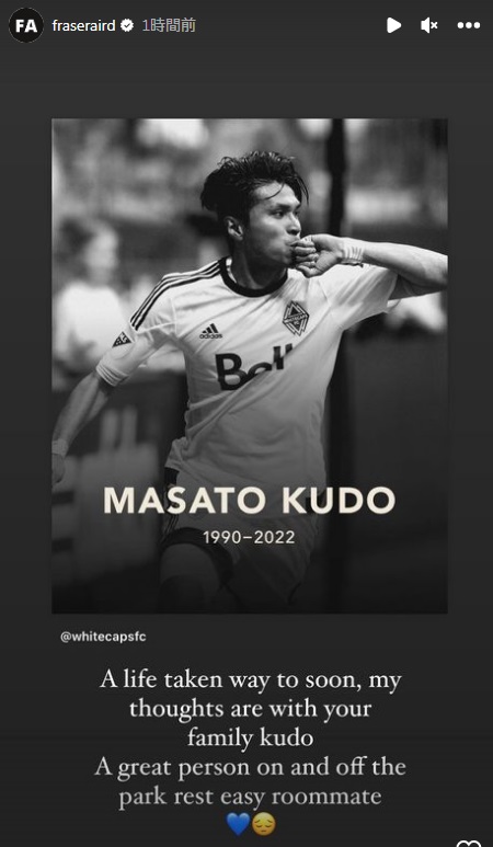 フレイザー・アード「逝くのがあまりに早い、工藤の御遺族のことを思う。ピッチ内外で素晴らしい人だった。ルームメイトに安らぎを」