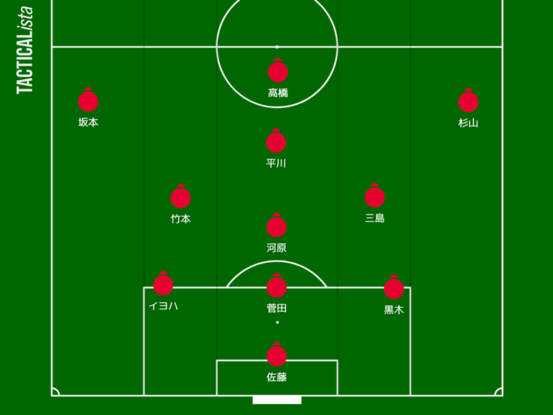 アンカーは絶対的司令塔にしてキャプテンの河原創が務め、インサイドハーフは右がサッカーIQの高さを活かし潤滑油として機能する三島頌平、左はトップ下およびCFでも起用される竹本雄飛で、藤田一途と田辺圭佑が途中出場から推進力をもたらす。