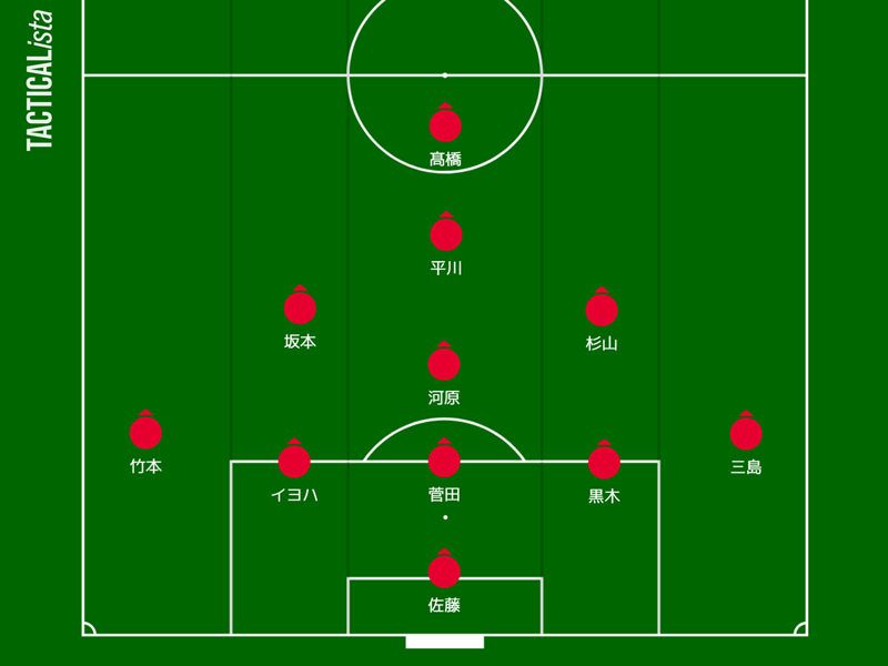 また、ピッチ上から見て取れるのは、“前への意識”だ。3バック&アンカーは流動的なパスワークの基盤となるビルドアップだけではなく、相手DF裏のスペースを狙ったフィードや球足が速い縦パスも織り交ぜていく。