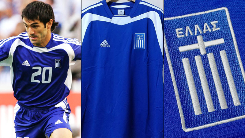 国を囲むエーゲ海を塑像させる美しい青と、ギリシャ十字を上に国旗を縦に配置したようなエンブレムが印象的なキットデザイン。サッカー界にいくつか存在する“奇跡の優勝”を象徴する一着。