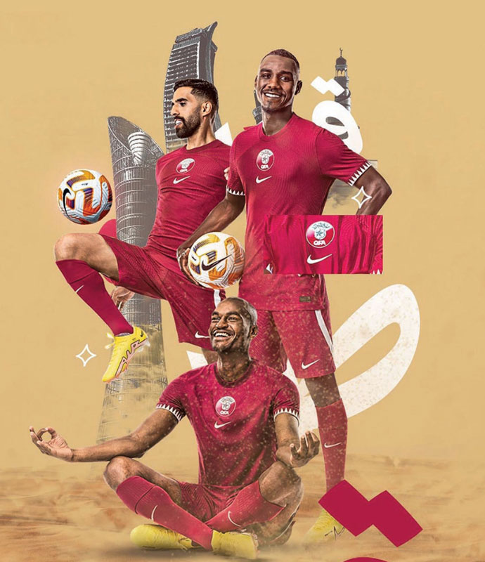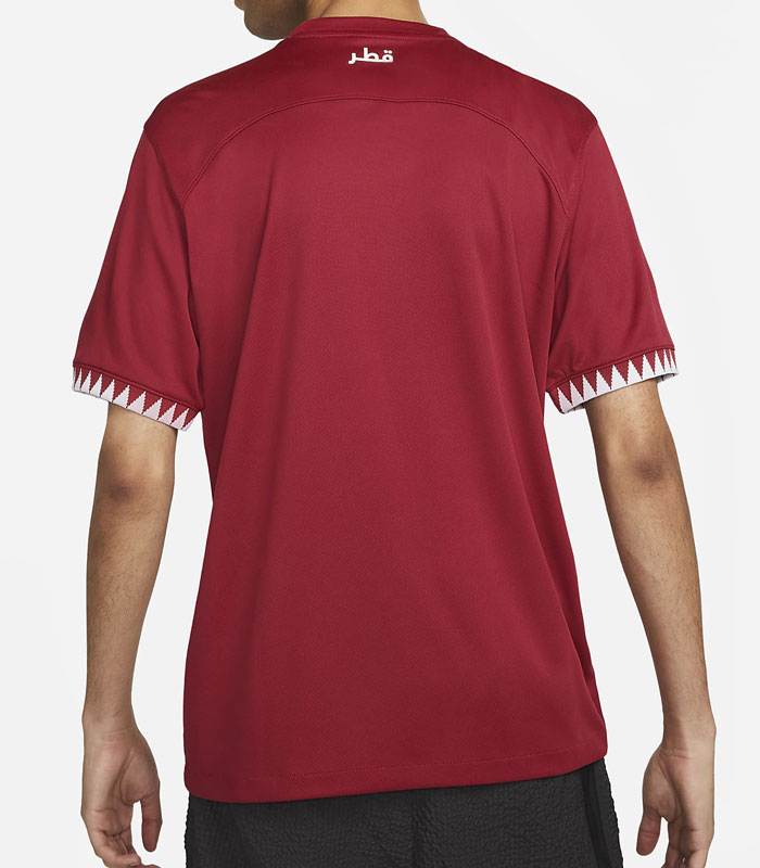 記念すべきW杯モデルとなる2022新ホームユニフォームは、定番のマルーンを基調色としたデザイン。袖口はジグザグ模様でカタール国旗を表現する。胸部中央にエンブレムを配置するスタイルは、カタールのキットでは珍しい。背面にはアラビア語で国名を刻む。