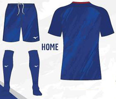 ホームキットはパンツとソックスもブルーを基調としたデザイン。パンツにも筆書の武田菱を大胆に描き、コンセプトの“怒涛”を全身で表現する。