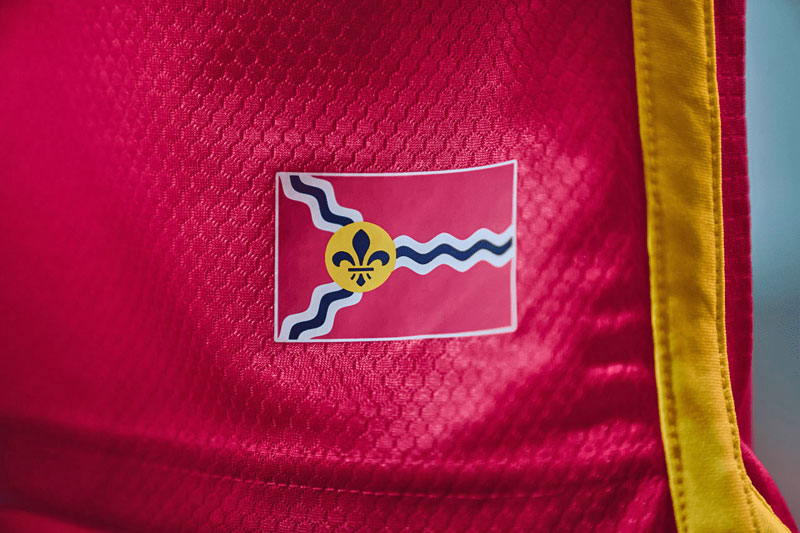裾部分にはホームタウンであるセントルイスの旗のジョックタグをプリント。前面のゲートウェイのグラフィックなど、このユニフォームはホームタウンに捧げたデザインだという。