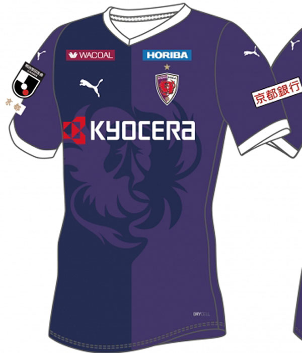 前面はエンブレムに描いている鳳凰を大胆に配置し、京都の街並を思わせる半々の2トーンで構成。シンプルかつクリーンなルックスがピッチ上の選手たちを輝かせる。