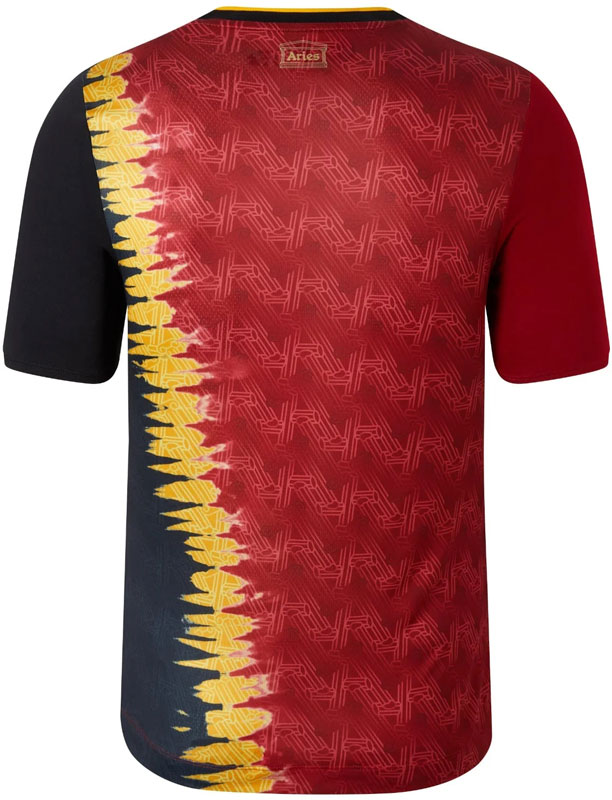 今季の通常ユニフォームに使用するレッド、イエロー、ブラックをマーブリングしたAriesのオリジナルグラフィック・デザイン。右胸のNBロゴの下にAriesのロゴをダブルネームを配したスペシャル限定ユニフォーム。