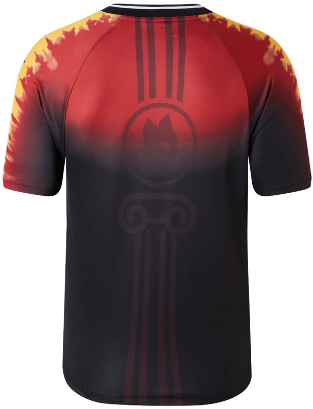 右胸のNBロゴの下にAriesのロゴをダブルネームを配したスペシャルなプレゲームシャツ。ストリートテイストの中であえてブラックカラーで提案した一着。後身頃はホームカラーとフラックをグラデーションで表現し、センターにチームの象徴であるオオカミをプリントする。