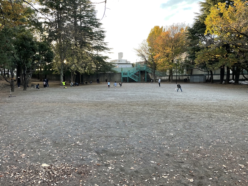 徐々に日が陰り始めた公園では、この日も子供や親子連れなど多くの人が楽しんでいた。二段構えの公園で、やや上段(写真左手)に滑り台などがある程よいスペース、下段が広場というつくりになっている。