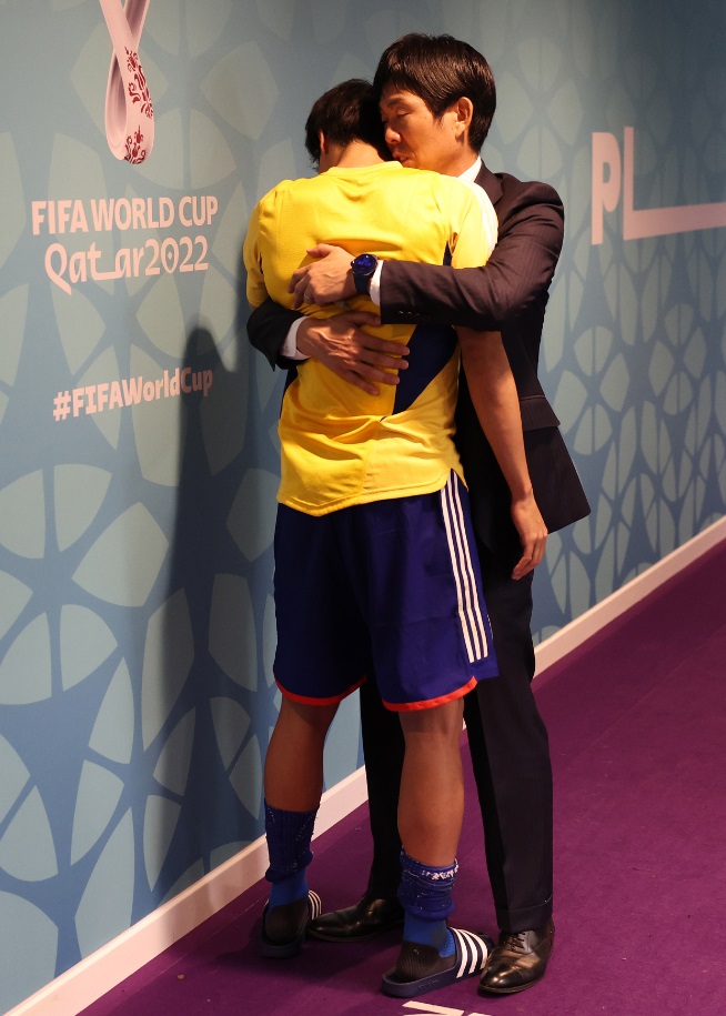 森保一監督が選手を抱きしめると何か言葉をかけており、ぐっとくるものがある。