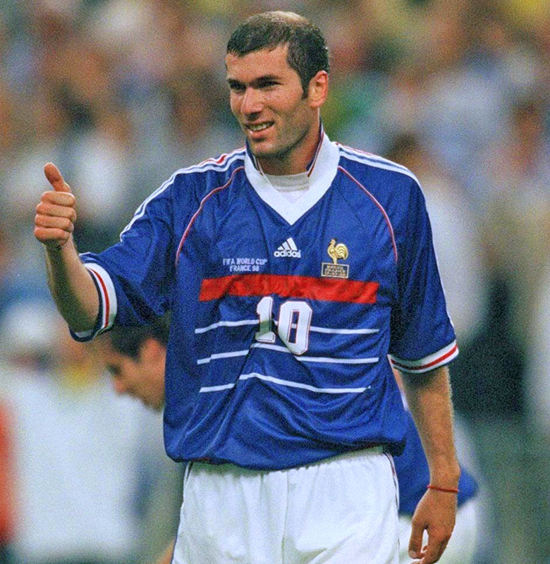 フランスが自国開催の98年大会でW杯を初優勝した記念すべきユニフォーム。前面の水平ストライプは、初の欧州制覇を成し遂げたEURO1984で着用のユニをモチーフとしたもので、EUROとW杯という2つの初優勝を見届けたデザインとなった。