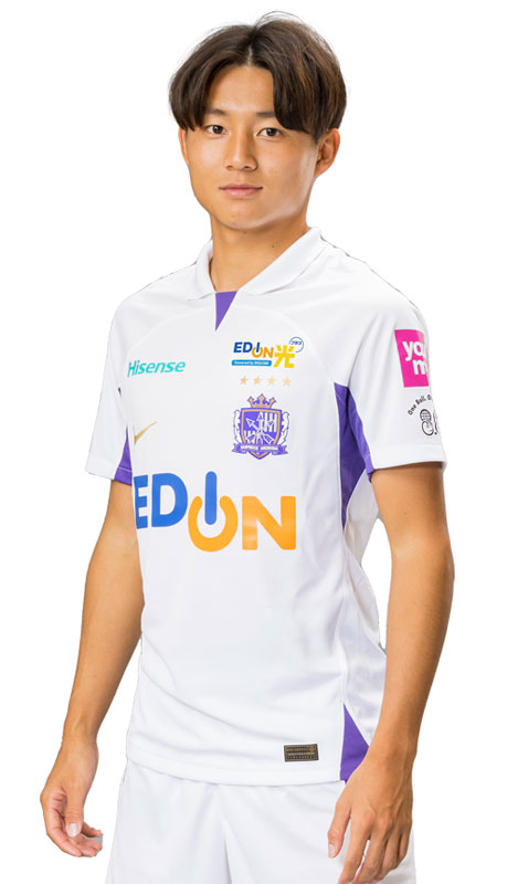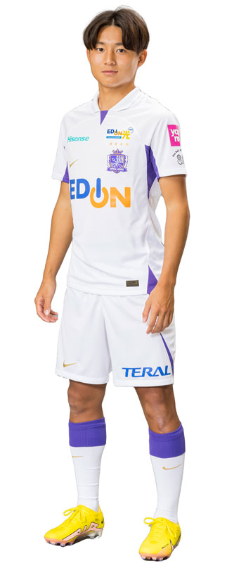 2023新アウェイユニフォームはホワイトを基調としたカラーコンビネーションを継承し、シャツ、パンツ、ソックスの全てにクラブカラーのバイオレットを配した。シャツのサイドからパンツのサイドに繋がるバイオレットの湾曲は、「まさに今この瞬間に放たれる矢」と「強くしなる弓」のイメージだ。