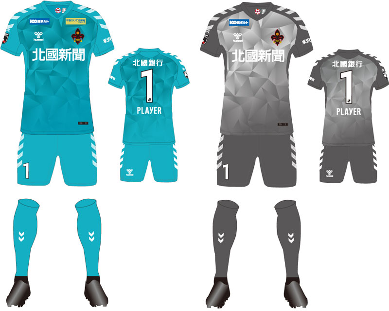 GKユニフォームは2色展開で、引き続き1st(ホーム)にターコイズブルー、2nd(アウェイ)にガンメタルグレー。どちらもグラフィックは金箔と雪の結晶を採用する。