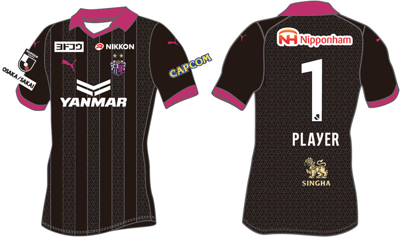 画像の各部スポンサーは、胸に「YANMER(ヤンマー)」、背中上に「Nipponham(日本ハム)」、背中下に「SINGHA(シンハー)」、鎖骨右に「ヨドコウ」、鎖骨左に「NIKKON(ニッコンHD)」、左袖に「CAPCOM(カプコン)」。なお、パンツは現時点で公開されていないためスポンサーロゴについては不明。