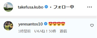 FC東京時代のチームメイトである橋本拳人(現ウエスカ)もこれに反応。「なんて美しんだ!すごいぞ、タケ」とスペイン語でコメントすると、久保も「ありがとう!拳人君」とスペイン語で返信していたぞ。