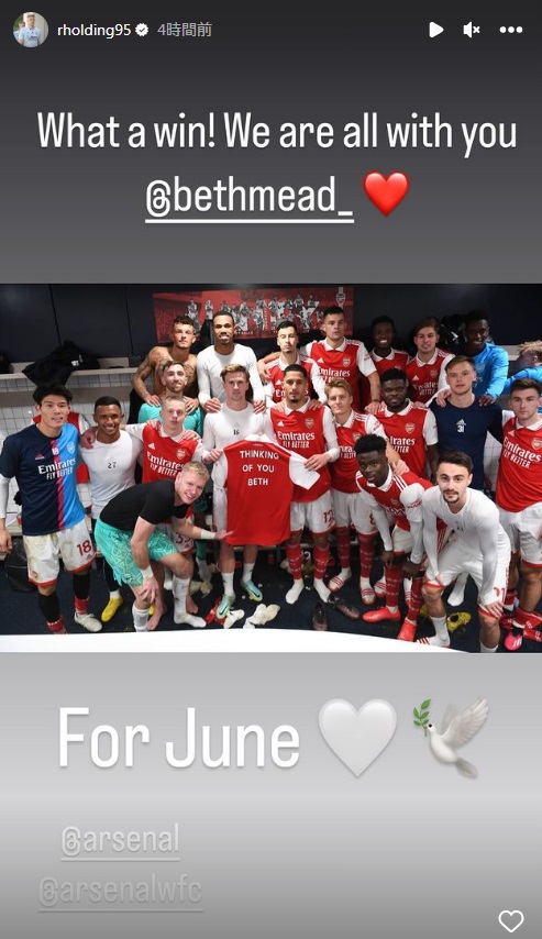 試合後、冨安健洋らアーセナル選手たちは「君のことを思っているよ、ベス」とのメッセージが書かれたユニフォームを掲げていた。
