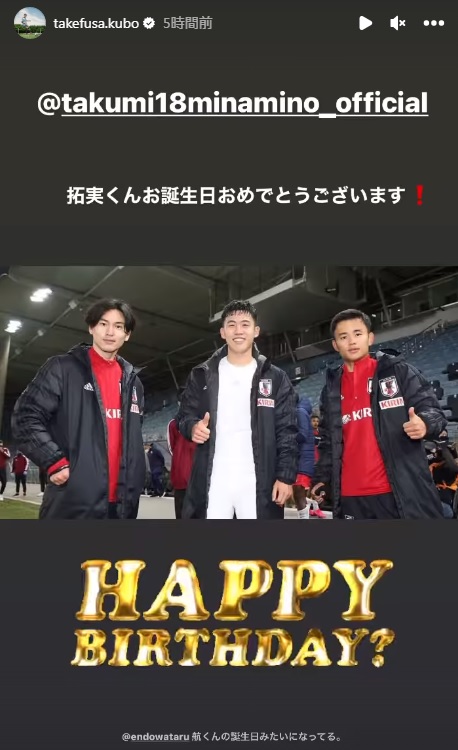 久保建英は「拓実くん、お誕生日おめでとうございます!」として遠藤航との3ショットを公開。そのうえで、「(中央にいる)航くんの誕生日みたいになってる」とも綴っていた。