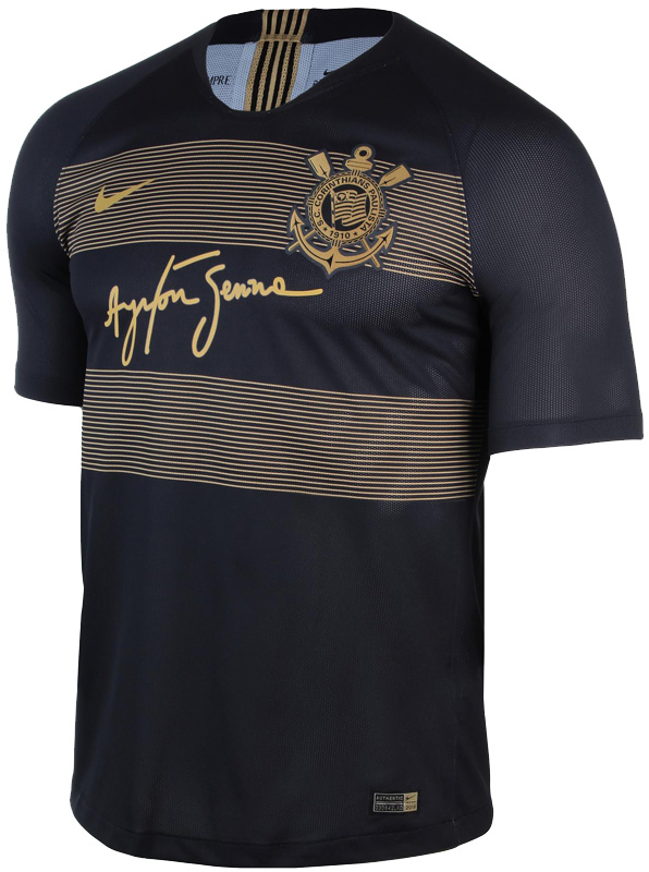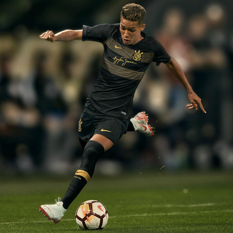 コリンチアーノ(コリンチャンスファン)だった伝説のブラジル人F1ドライバー、アイルトン・セナを讃えたサードキット。ブラックとゴールドのカラーリングは、セナがロータス所属当時のマシン「ロータス98T」を彷彿とさせる。セナの優勝回数「41」を讃えて、胸には41本のゴールドのストライプをあしらう。