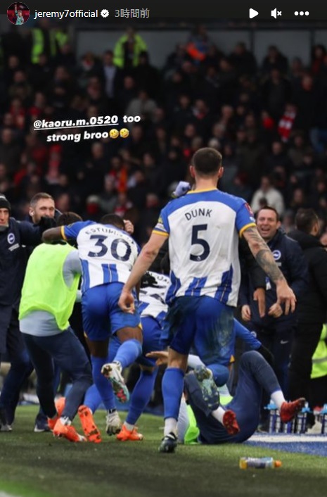 そのサルミエントは「強すぎるよ、兄弟(笑)」と三笘に倒された写真をSNSにポストしていた。