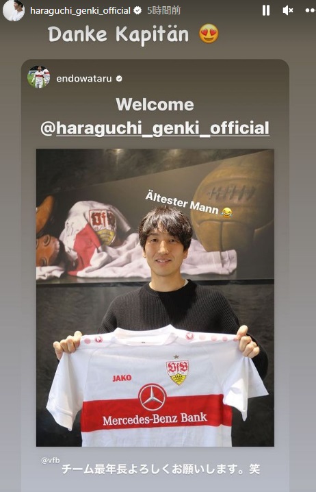 遠藤は「チーム最年長よろしくお願いします。笑」とのコメントともに原口の加入を歓迎していた(Ältester Mannもドイツ語で最年長の男という意味)。