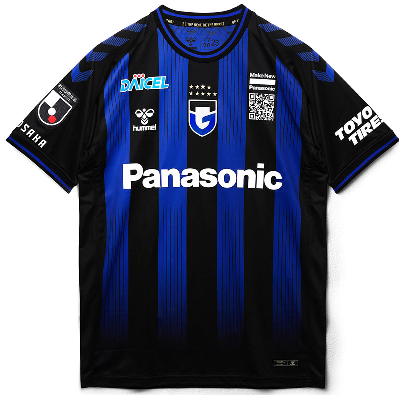 新たにhummelがサプライヤーとなった2023ユニフォーム。伝統の“青黒のストライプ”を継承し、「青と黒の誇り」「青と黒の戦士」でガンバ大阪そのものを表現した。