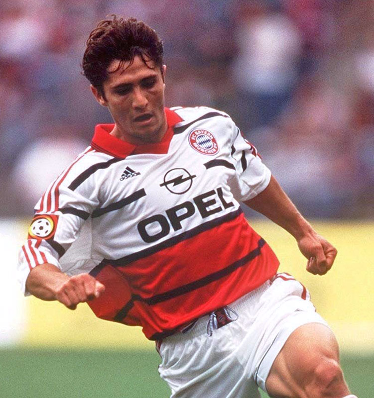 現在では圧倒的にドイツテレコムのロゴマーク「T」が定着しているが、かつての「OPEL」ロゴも忘れがたい。このシーズンのアウェイは赤と白がほぼ半々の割合で、バイエルンでは比較的珍しいタイプのデザイン。「OPEL」ロゴとの調和も見事な一着だ。
