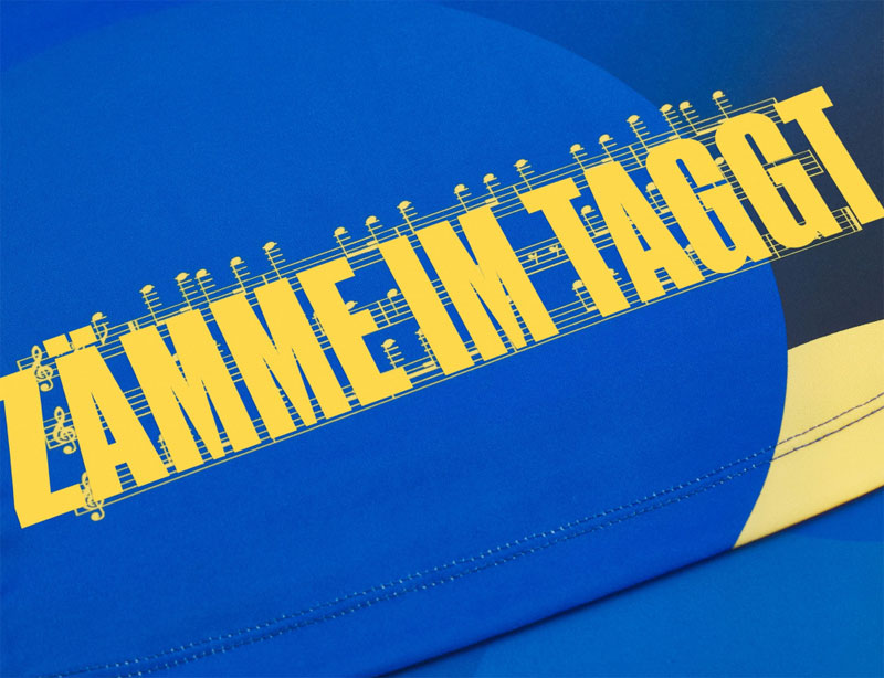 背面腰部分には今年のカーニバルのモットー“Zämme im Taggt を、楽譜に重ねるようにデザイン。